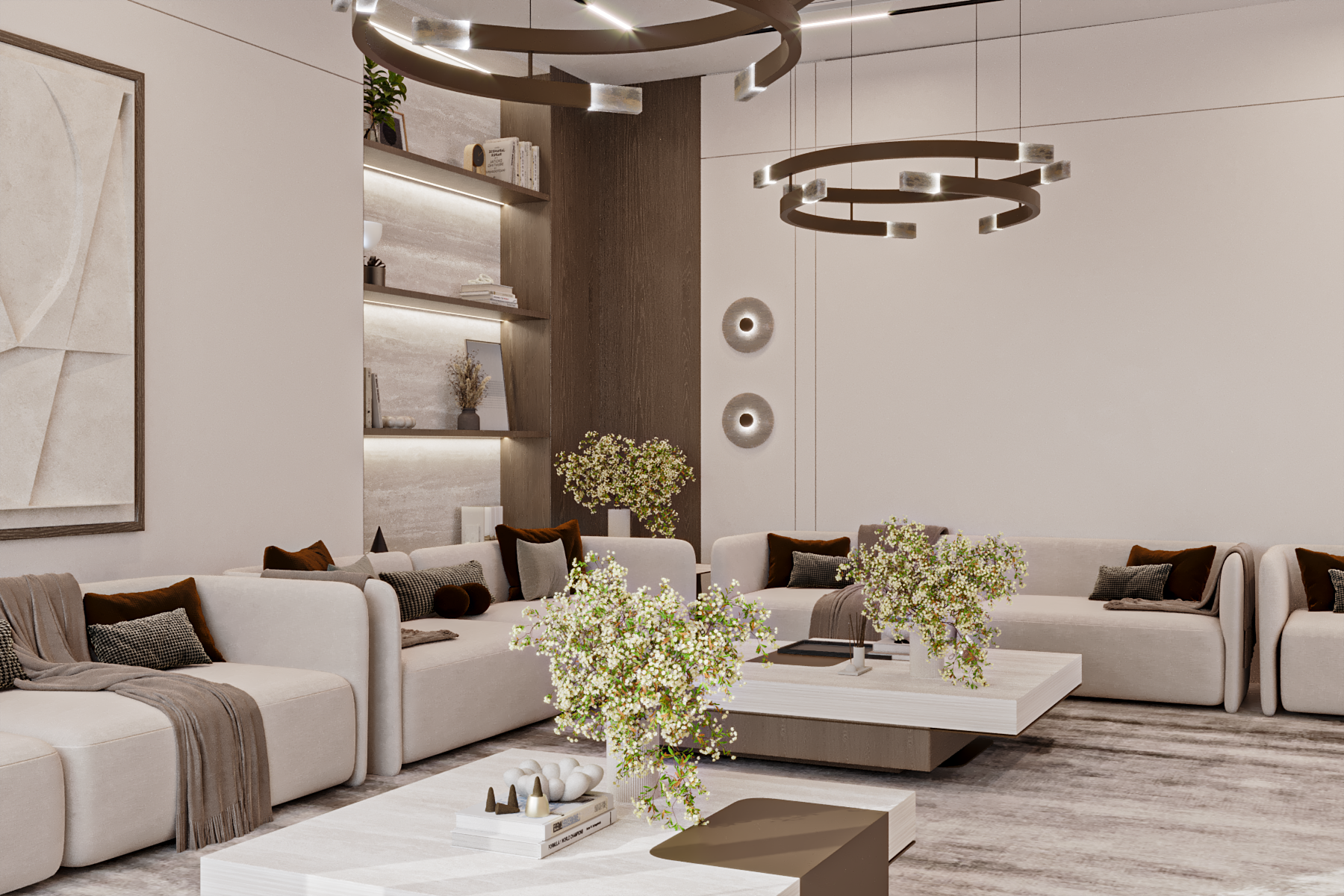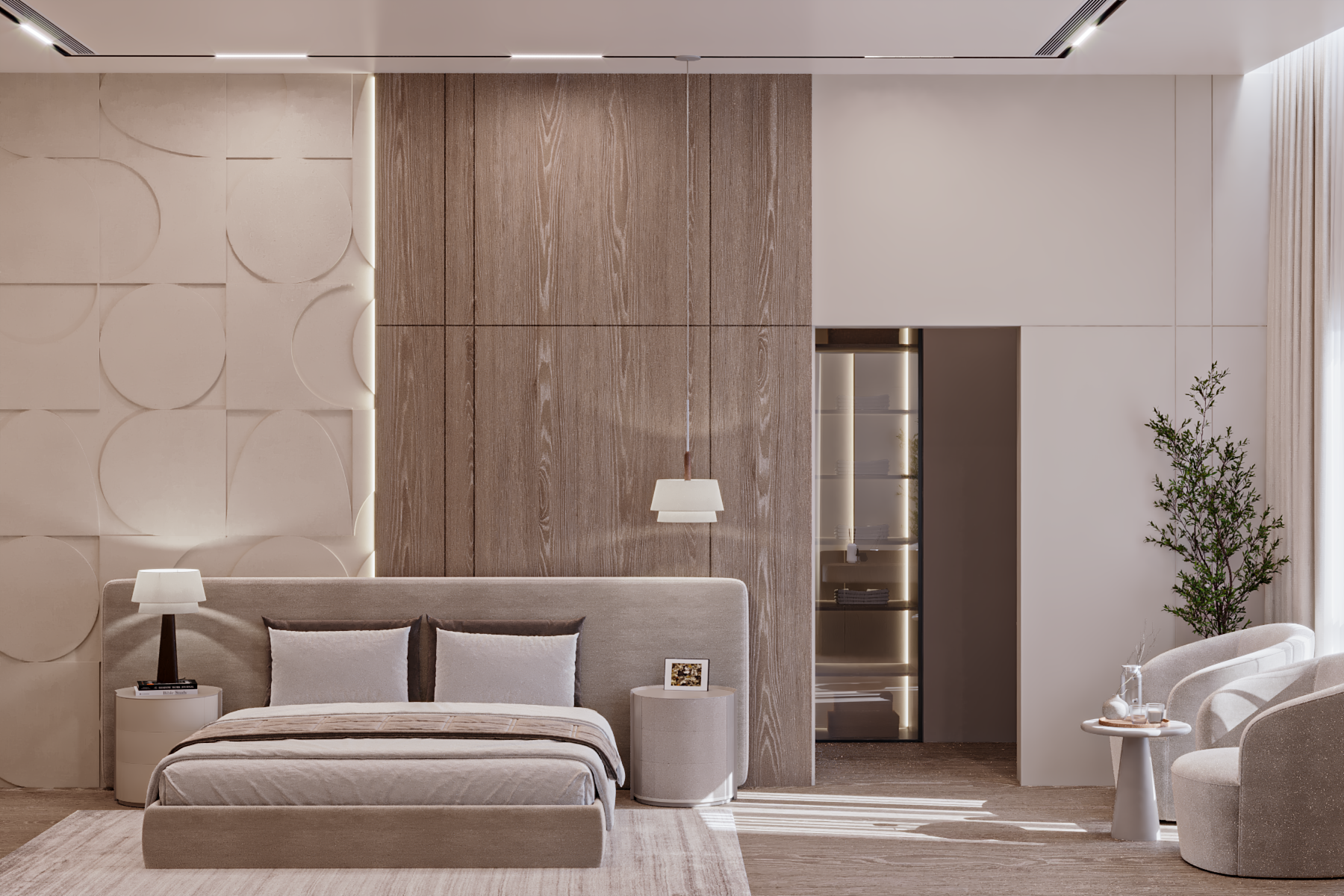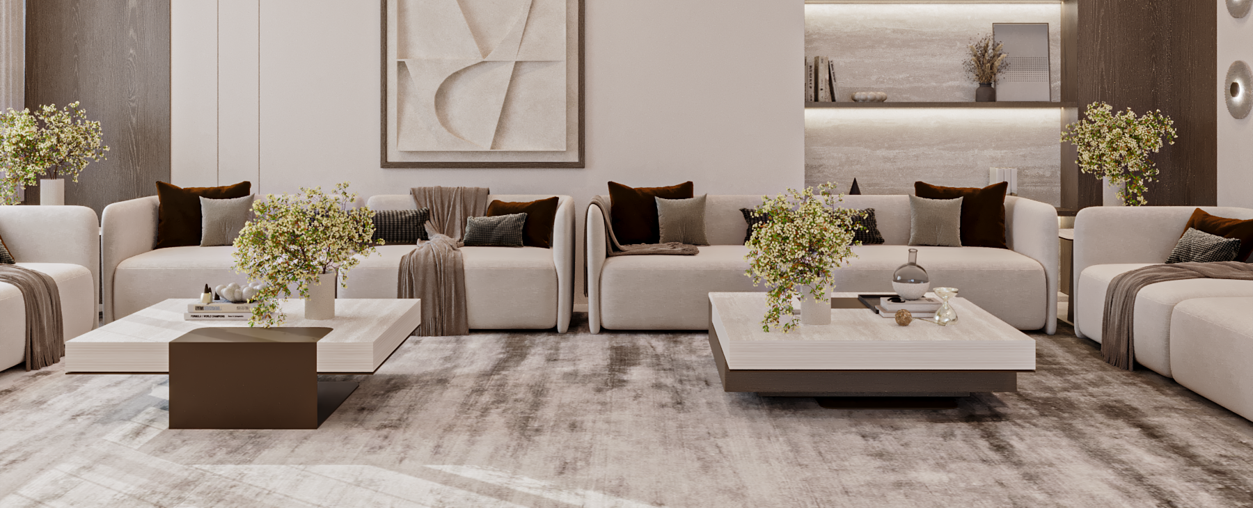 A harmonious palette of neutral tones, layered textures, and bespoke lighting details shapes interiors that feel both sophisticated and inviting, creating a timeless residential environment defined by comfort, balance, and understated elegance.