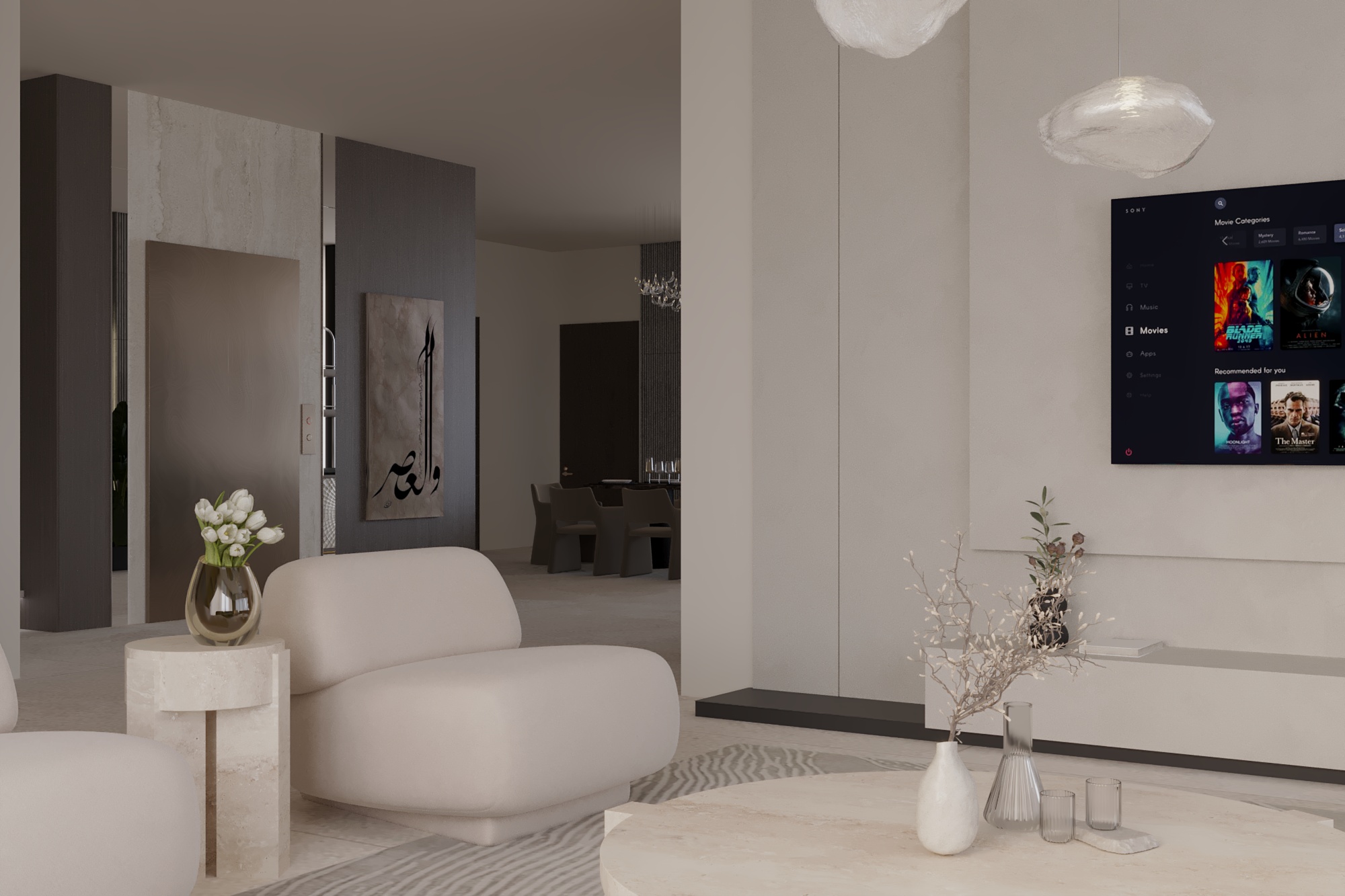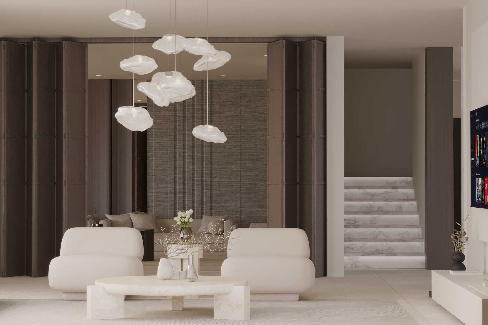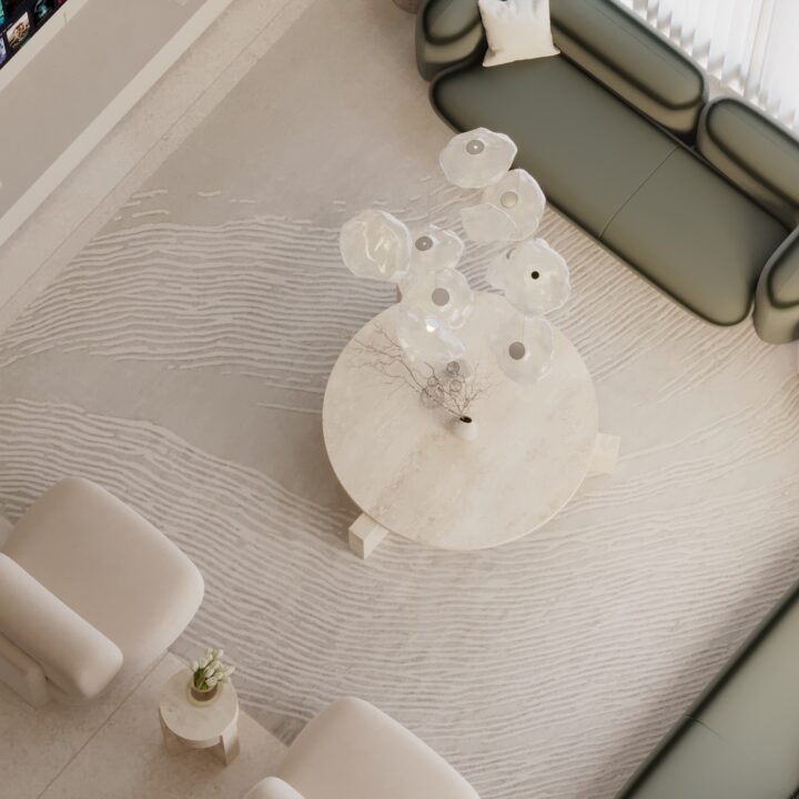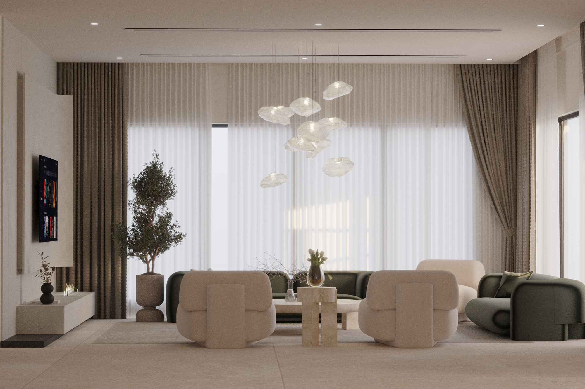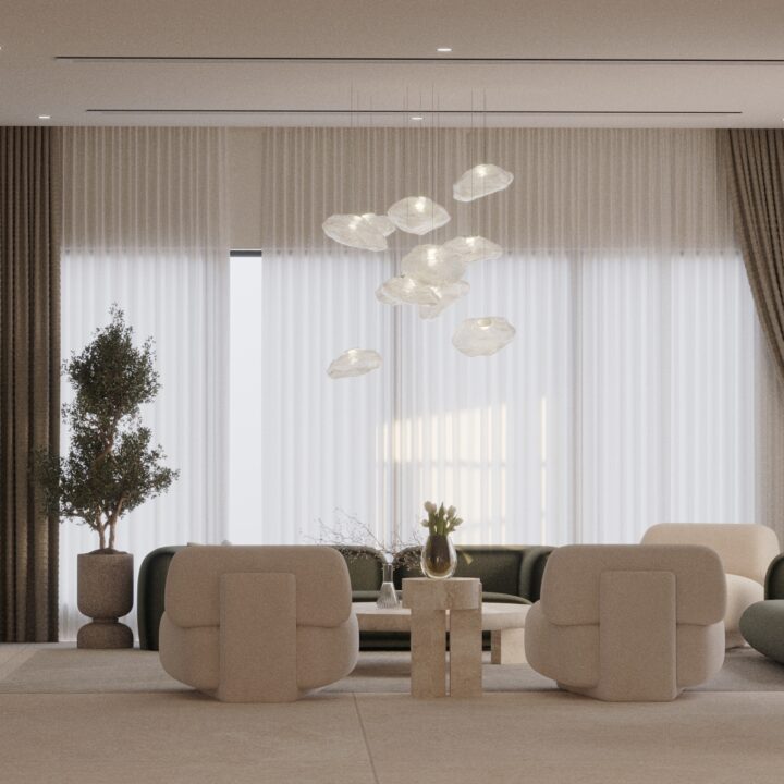 This interior design project is a definitive expression of “Quiet Luxury,” blending contemporary minimalism with organic textures. The space is meticulously curated to evoke a sense of tranquility and sophisticated warmth, utilizing a neutral color palette grounded in sandy beiges, olives, and burgendy.