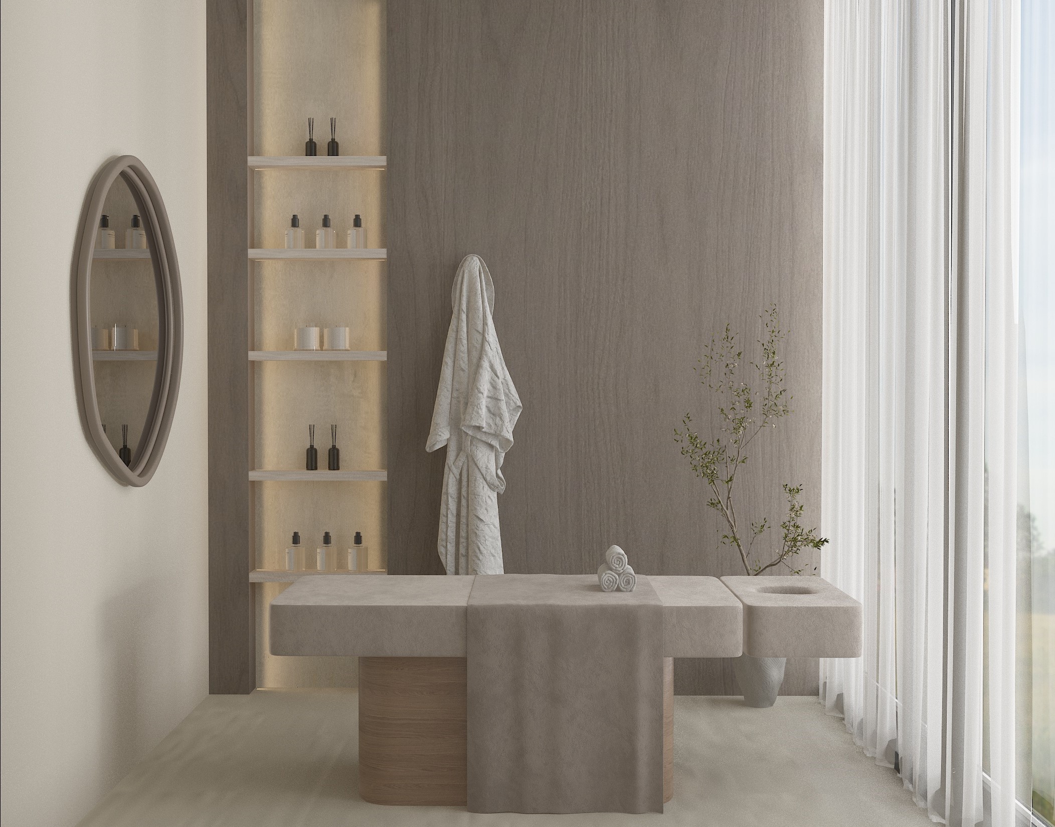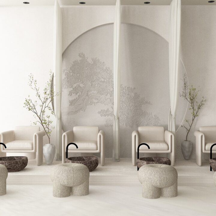 Neutral tones, natural textures, and subtle architectural details were carefully selected to enhance the sense of openness and serenity. The layout was thoughtfully planned to ensure smooth circulation for both clients and staff, allowing each service area to feel private yet visually connected.